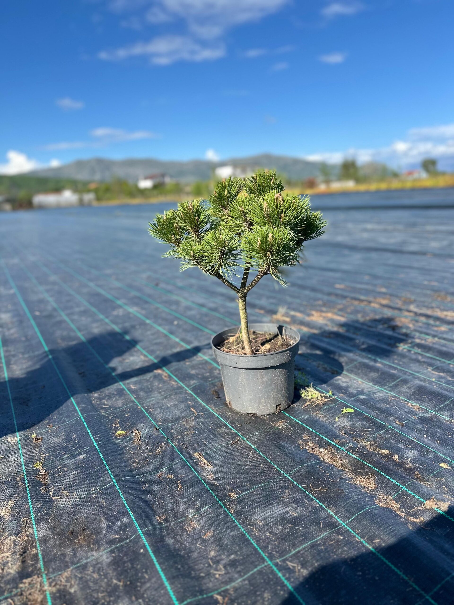 The Mugo Pine (Pinus mugo) is an evergreen, compact, slow-growing tree known for its narrow form and dense branches. This type of tree is ideal for small gardens, as a ground cover, and can also be used as a decorative element in various landscapes. It has a regular shape and a dark green color, giving it a fresh and natural appearance all year round. The Mugo Pine is an excellent choice for those looking for a tree that remains small and compact, making it suitable for limited spaces.